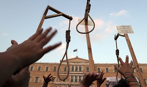 Görögországban szintén forrósodik a helyzet, és az ország várhatóan szintén táptalaja lesz a „világforradalomnak“. Ennek jelenlegi motora a provokatív, még drasztikusabb megszorításokat ígérö „második mentöcsomag“. A görög parlament elötti téren a napokban egy akasztófa jelent meg: