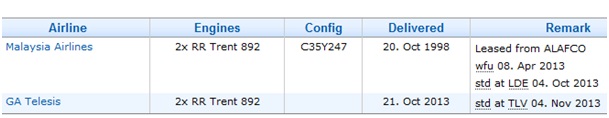 A kvázi „nemzetközi repülönyilvántartónak“ számító planespotters.net adatbázisa szerint is az MH-370-es „ikertestvére“ 2013. október 21-én átkerült a malajziai légitársaság tulajdonából egy kevésbé ismert légitársaság, a GA Telesis tulajdonába, mely azt 2013.november 4-töl egy tel-avivi hangárban tárolta Izraelben: